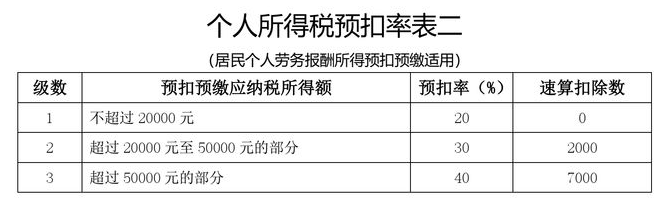 勞務(wù)報酬所得適用20%至40%的超額累進(jìn)預(yù)扣率(見《個人所得稅預(yù)扣率表二》)。